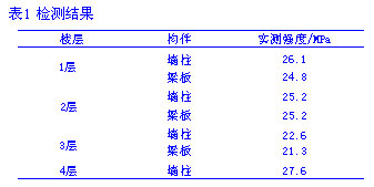 根据设计图纸 ,本工程抗震设防烈度为 7度(第一组 ) ,设计基本加速度值为 0115 g,框架抗震等级为 3级 ,剪力墙抗震等级为 2级;结构安全等级为 2级 ,基本风压为 0160 kN /m2,地面粗糙度按 A类取用;1~5层为底部加强区。混凝土设计强度:7层以下 (含 7层 )采用 C40混凝土,8~16层顶采用C35混凝土,17层以上均采用C30混凝土。设计使用年限为50年,室外地面以上构件所处的环境条件均为室内正常环境。本工程场地类别为 Ⅱ类 ,主楼采用桩筏基础 ,采用 <800 mm的钻孔灌注桩 ,以粉质粘土层作为桩端持力层 ,桩进入持力层不小于116 m,单桩承载力设计值不小于 3000 kN,有效桩长不小于 22 m。2005年初 ,建至地上4层时发现 ,主楼 1~4层的混凝土强度远低于设计强度,经有关单位进行多次检测,证明主楼 1~4层的混凝土强度确实不满足设计要求,检测结果见表1。