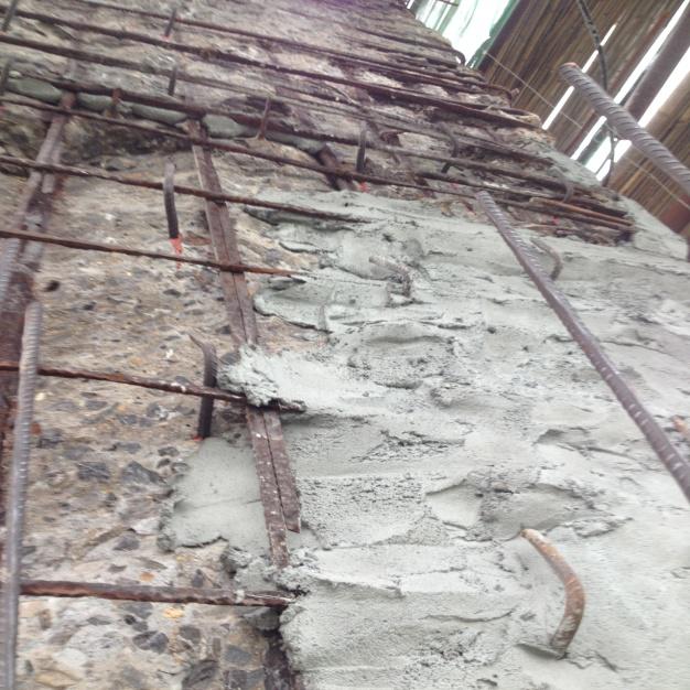 3、与卫生间相邻的楼梯间墙体,长期受潮湿环境影响,墙体内钢筋锈蚀比较严重。加固处理方法挂TBX-6非金属筋材@150mm网片外抹3cm聚合物砂浆处理。