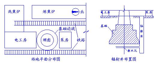 位于化工总厂8#、9#炼焦炉旁,烟囱东西两侧均为铁路轨道,相距 10m 。烟囱北侧为泵房,南侧为铁制爬梯及各种室外管道和电工房。场地平面布置见图。