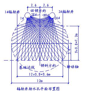 ③布置射水孔。在转动轴与基础圆相交的弦上,以及上述交点的垂直弦上以 0.8m 间距设立射水孔点,该点与两个辐射井中心的连线构成一条射水孔通道,每眼辐射井按此规则布置28个射水孔,成辐射状均匀交叉分布于基础底面之下。孔深5.0~ 11.4m 不等,平面分布见图。射水孔孔径设计为 150mm ,水平成孔,直至拟定转动轴处,枪口出水压力为1.0MPa,出水速率 40L /min。