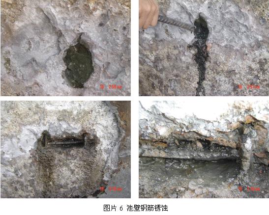 4、由于该构筑物建造于1991年,根据我们对现场的勘查,由于该构筑物在使用过程中,曾由于砂浆防水层的破坏而进行过修缮,但在该次修缮过程中未对钢筋混凝土内部的混凝土和钢筋锈蚀破坏进行必要的处理,从而给结构留下了隐患。