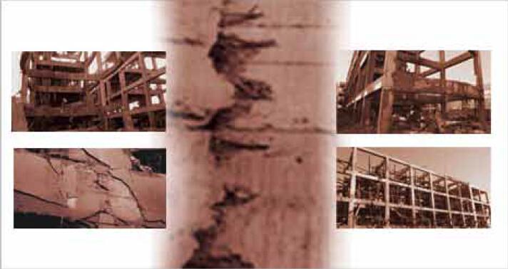 建筑承受地震作用,引起上下振动、水平摇摆、左右扭转三种破坏形式。上下结构按相对刚度承担、分散地震能量。若上部结构损坏,则基础可能完好;若上部结构完好,则基础可能损坏。