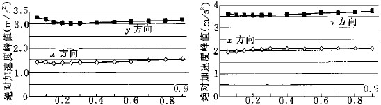 橡胶垫阻尼比取不同值时,隔震层两个方向的绝对加速度峰值和结构顶层两个方向绝对加速度峰值分别见图5、6。图中表明,当橡胶垫阻尼比较小时,增加橡胶垫阻尼比可以减小结构隔震层和上部楼层的加速度反应,当橡胶垫阻尼比大于某临界值后(对固定结构,该值因地震波不同而变化),继续增加橡胶垫阻尼比又会加大结构的加速度反应。