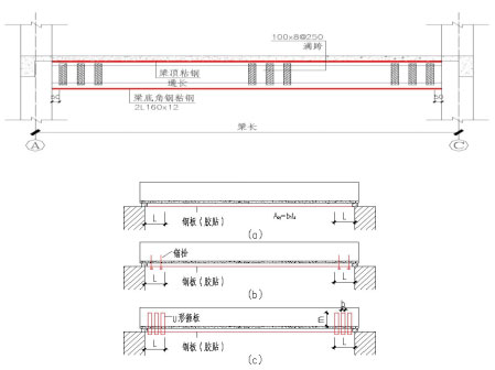 粘钢加固是在混凝土构件表面用特制的建筑结构胶粘贴钢板,使其与混凝土形成统一的整体,利用钢板良好的抗拉强度达到增强构件承载能力及刚度的一种加固方法。外部粘钢的锚固至关重要,必须保证钢板在拉断之前不发生脱胶等粘结破坏现象,既要求钢板在锚固区的粘结受剪承载力Vu 必须大于钢板的受拉或受压承载Vu。据此,技术总监对于单纯以胶粘结锚固时,钢板在其加固点外的锚固长度L 不得小于下式规定。
