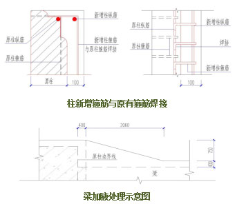 为有效提高承载能力,改善建筑的耐久性,加固采用包括粘钢、包钢、置换混凝土、局部增加现浇钢筋混凝土剪力墙、增设钢混结构、植筋、植栓等工艺。